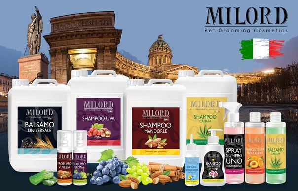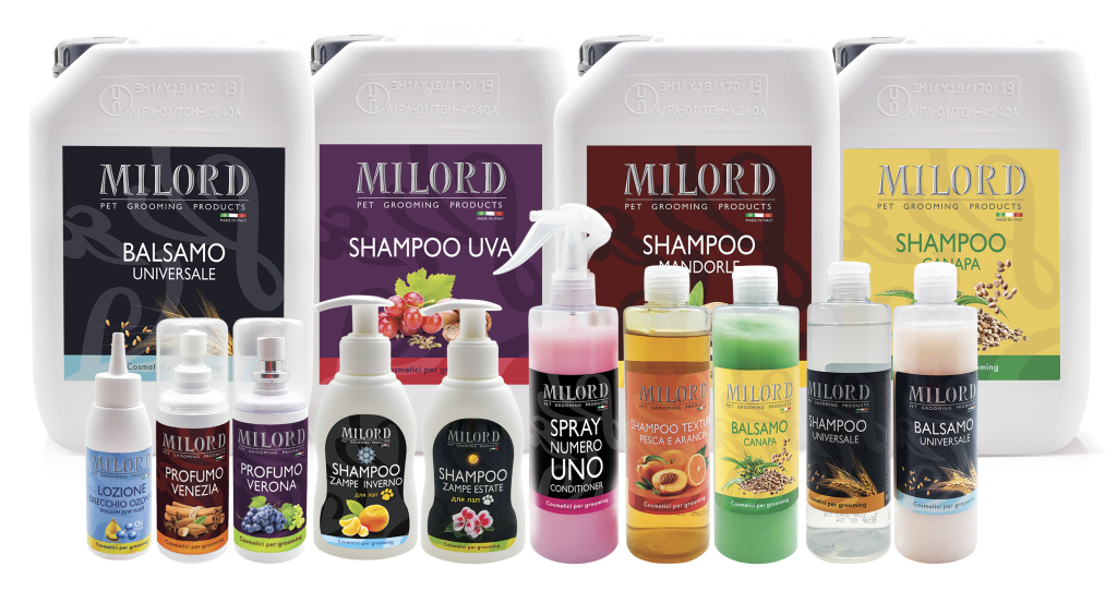 Линия косметики MILORD создана с учетом особенностей нашей экологии, жесткости воды, аллергических реакций животных. Косметика от фирмы Milord включает в себя не только шампуни, но и маски, спреи для расчесывания, парфюмы, бальзамы и масла для шерсти собаки, лосьоны для ухода за глазами и глазами.