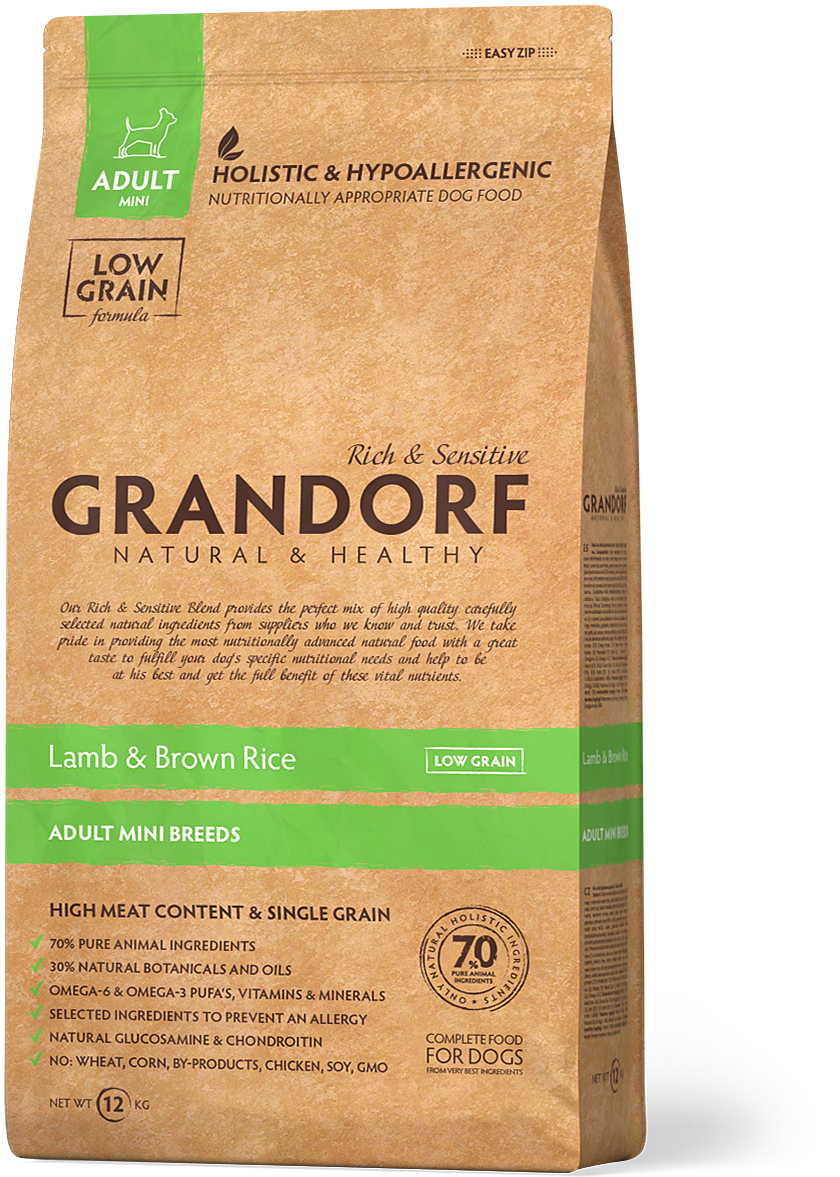 - GRANDORF Lamb&Brown Rice MINI - ягненок с бурым рисом для мини пород. Прекрасно зарекомендовавшая себя классика. Самая продаваемая позиция корма GRANDORF у нас в салоне. Уже многие годы он неизменно лидирует в продажах, подкупает своим стабильным качеством и понятным составом.