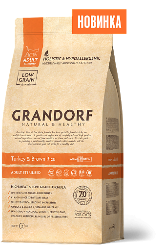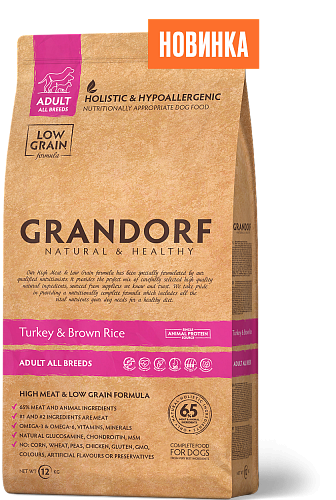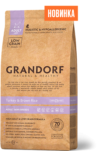 - GRANDORF Turkey&Brown Rice MINI - индейка с бурым рисом для мини пород. НОВИНКА на рынке! Корм с ОДНИМ ИСТОЧНИКОМ ЖИВОТНОГО БЕЛКА, ОДНИМ ИСТОЧНИКОМ УГЛЕВОДОВ для малышей с самым чувствительным пищеварением. Короткий и понятный состав, мелкая гранула, хорошя поедаемость - все, что нужно для счастья заботливому владельцу!