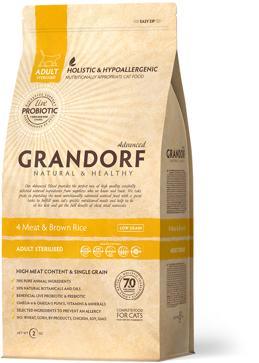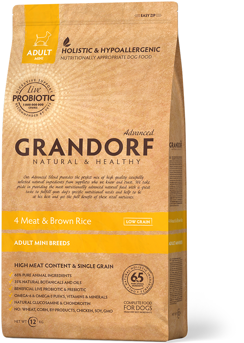 - GRANDORF 4Meat&Brown Rice - 4 вида мяса с пробиотиками для мини пород. Секрет этой формулы - миллиард живых пробиотиков. Они ежедневно поддерживают микрофлору кишечника, улучшают пищеварение, усвоение питательных веществ и предотвращают аллергию у вашей любимой собаки. Корм для тех, кто выбирает лучшее для своего питомца.